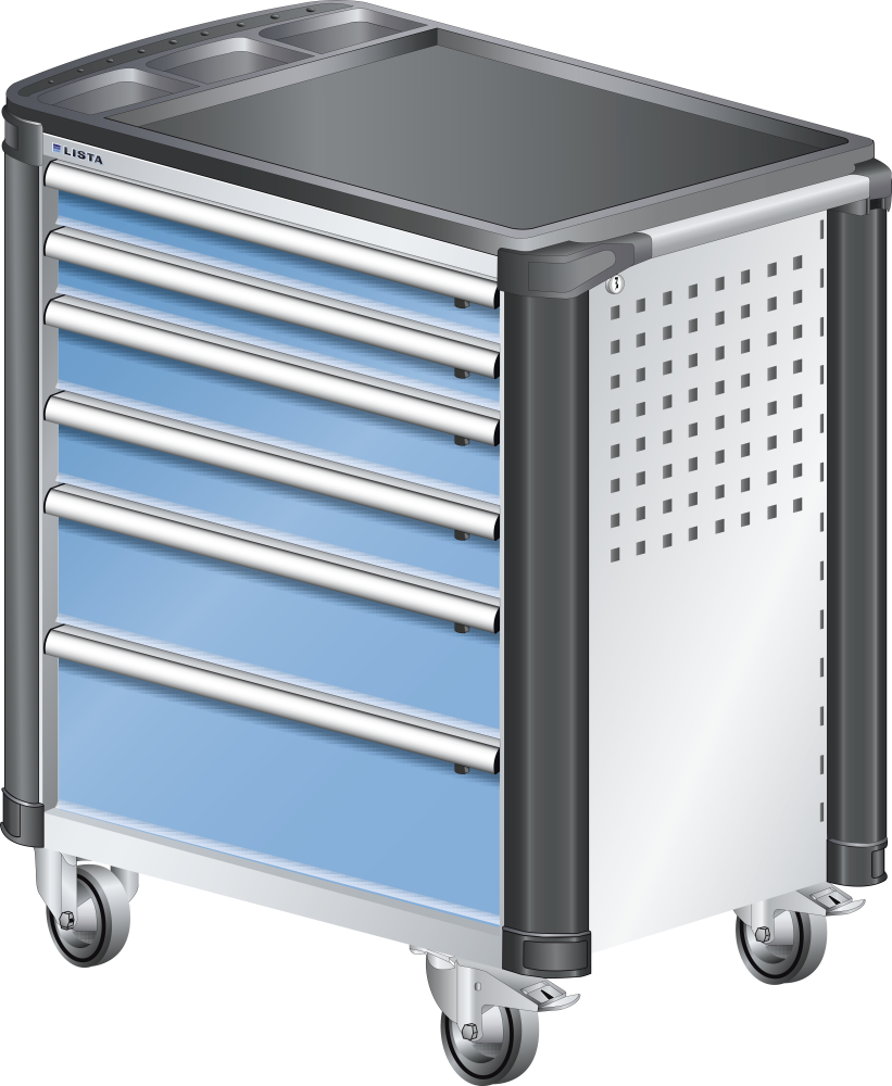 Carro de taller 36x27E (AxPxA) 894x525x928mm 6 cajones (2x75/2x100/1x150/1x200) 40kg con cubierta de plástico y protección de esquinas retén de seguridad sencillo a la derecha KEY Lock Gris luminoso RAL 7035 / Azul luminoso RAL 5012