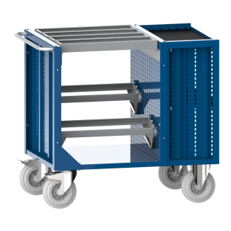 Carro de transporte de herramientas: existen modelos preconfigurados o composiciones individuales disponibles. Estructura cuidadosamente soldada en chapa de acero de alta calidad. Las paredes laterales se refuerzan con perfiles metálicos. En las paredes laterales hay guías ranuradas para colgar sin tornillos el bastidor, la bandeja portaconos y el bastidor de inserción. Las guías ranuradas sirven también para colocar los estantes regulables. Equipamiento: chasis con dos ruedas guía y fijas. Ruedas alojadas en cojinetes con cubiertas de caucho macizo. Ruedas móviles con dispositivo de bloqueo. Con barra de empuje amarilla galvanizada y pintura gris plateada Mica-Bond. Modelo: chapa de acero.