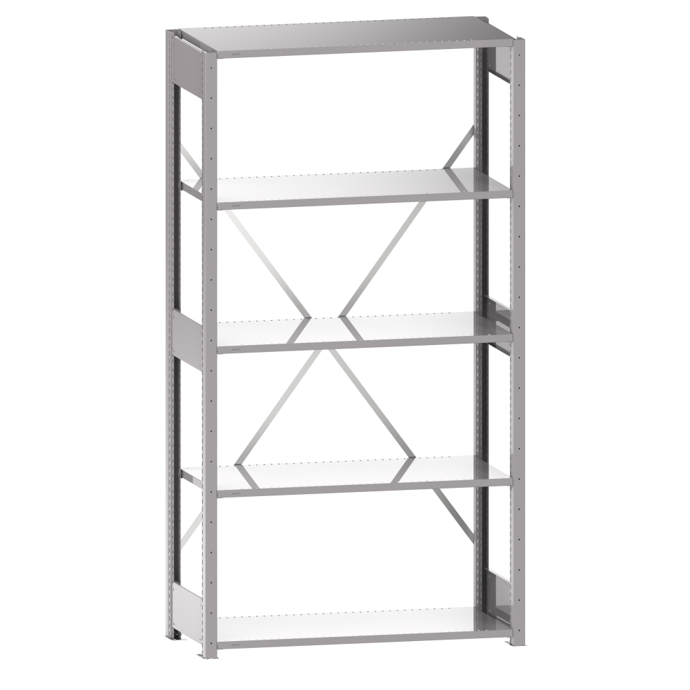 Estantes lisos o ranurados, carga máx. de estante 80, 160, 220, 280 y 400 kg: soportes incluidos. Espesor de estante de 25 mm. Modelo: chapa de acero. Color: según la carta de colores o galvanizado.