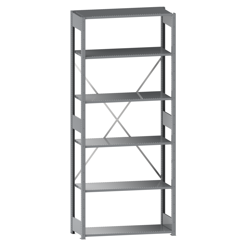 Par de soportes de estantería. Carga máx. del módulo, 2800 kg. Compuesto por 2 soportes de estantería, 2 placas de suelo y 3 barras transversales (4 barras transversales para una altura de 3000 mm). División ranurada de 25 mm para colgar los soportes a cualquier altura, atornillamientos incluidos. Modelo: soportes de estantería de perfil C, 40 × 75 mm, rematados por los seis lados para lograr una alta estabilidad. Placa de suelo galvanizada. Color: según la carta de colores o galvanizado.