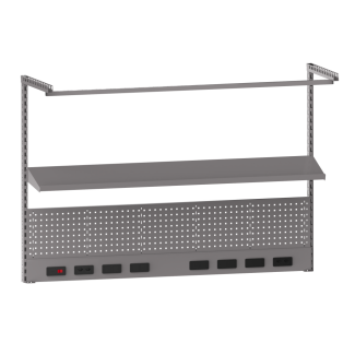 1 pared posterior de alimentación preconfigurado, para el montaje de columnas de soporte, con 1 interruptor y 5 enchufes de 230 V con cable de conexión