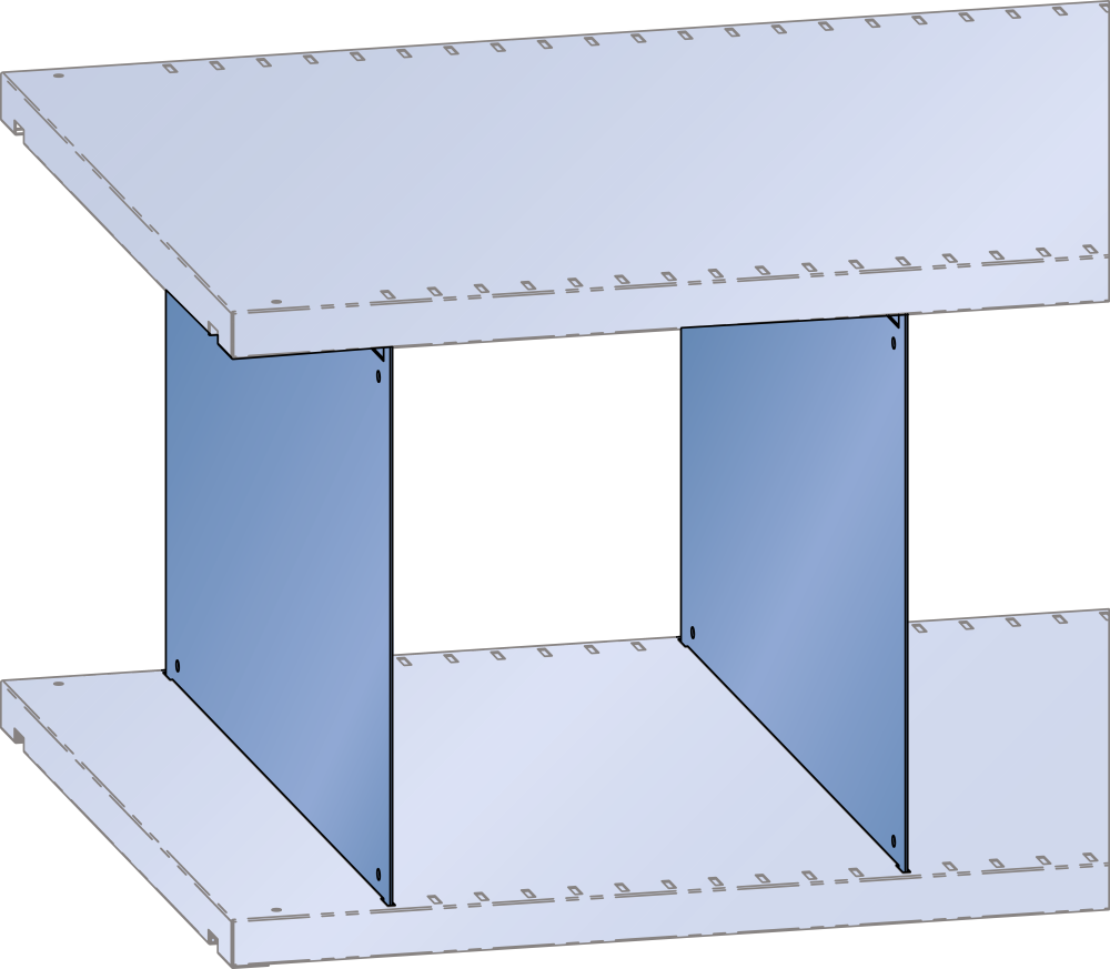 Separadores de repisas: para subdividir los estantes ranurados. La altura de los separadores de repisas, insertados arriba y abajo, depende de la distancia del estante. Distancia entre estantes en el interior = altura de los separadores de repisas. Modelo: chapa de acero. Color: según la carta de colores o galvanizado. Unidad de venta: 10 unidades.