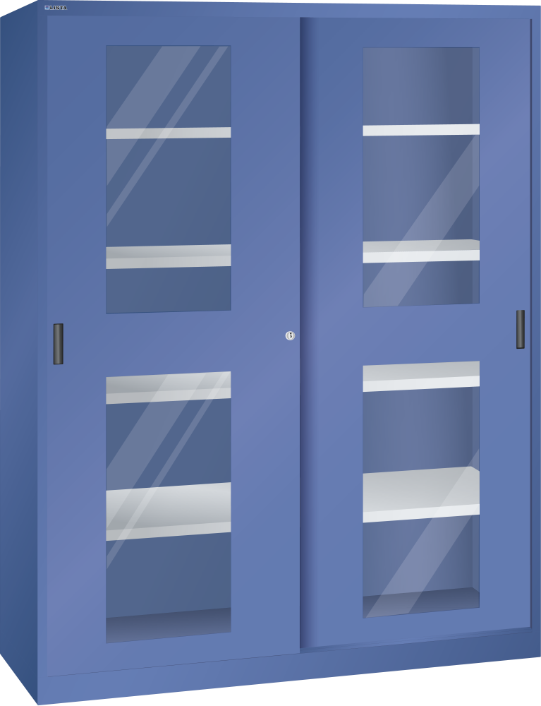 Armoires à portes coulissantes : Selon le modèle, les armoires sont équipées de : rayons amovibles galvanisés, épaisseur 30 mm, capacité de charge 60 kg. Rayons extensibles et tiroirs laqués, gris anthracite, RAL 7016, capacité de charge 50.