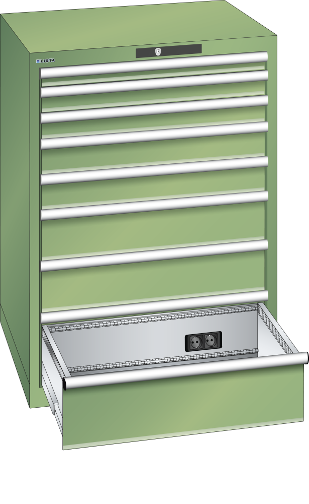 Armoire à tiroirs 36x36E (LxPxH) 717x725x1000mm 8 tiroirs (1x50/2x75/2x100/2x150/1x200) 75kg Type CH 1x230V RFID Lock Vert réséda RAL 6011