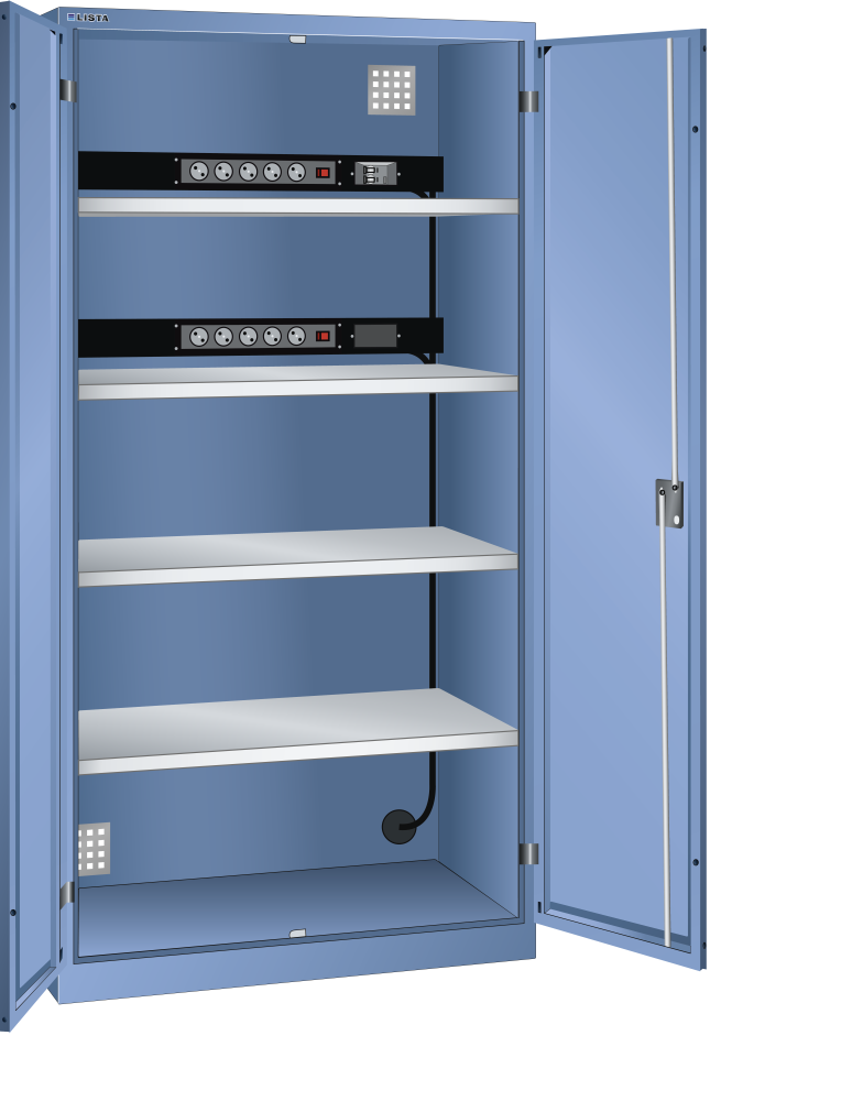 Armoires avec prises électriques à portes battantes : Selon le modèle, les armoires sont équipées de : rayons amovibles galvanisés, épaisseur 30 mm, capacité de charge 60 kg. Tiroirs laqués gris anthracite (RAL 7016), capacité de charge 50 kg. Blocs multiprises avec interrupteur marche/arrêt et 4 ou 5 boîtes à prises de courant 230 V.