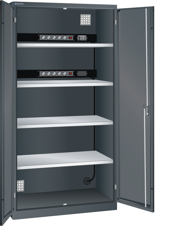 Armoires avec prises électriques à portes battantes : Selon le modèle, les armoires sont équipées de : rayons amovibles galvanisés, épaisseur 30 mm, capacité de charge 60 kg. Tiroirs laqués gris anthracite (RAL 7016), capacité de charge 50 kg. Blocs multiprises avec interrupteur marche/arrêt et 4 ou 5 boîtes à prises de courant 230 V.