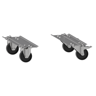 Paires de porte-roues : 1 paire de 2 roues pivotantes et 2 roues fixes. Porte-roues galvanisé sendzimir. Roues en nylon noir, roues en caoutchouc gris.