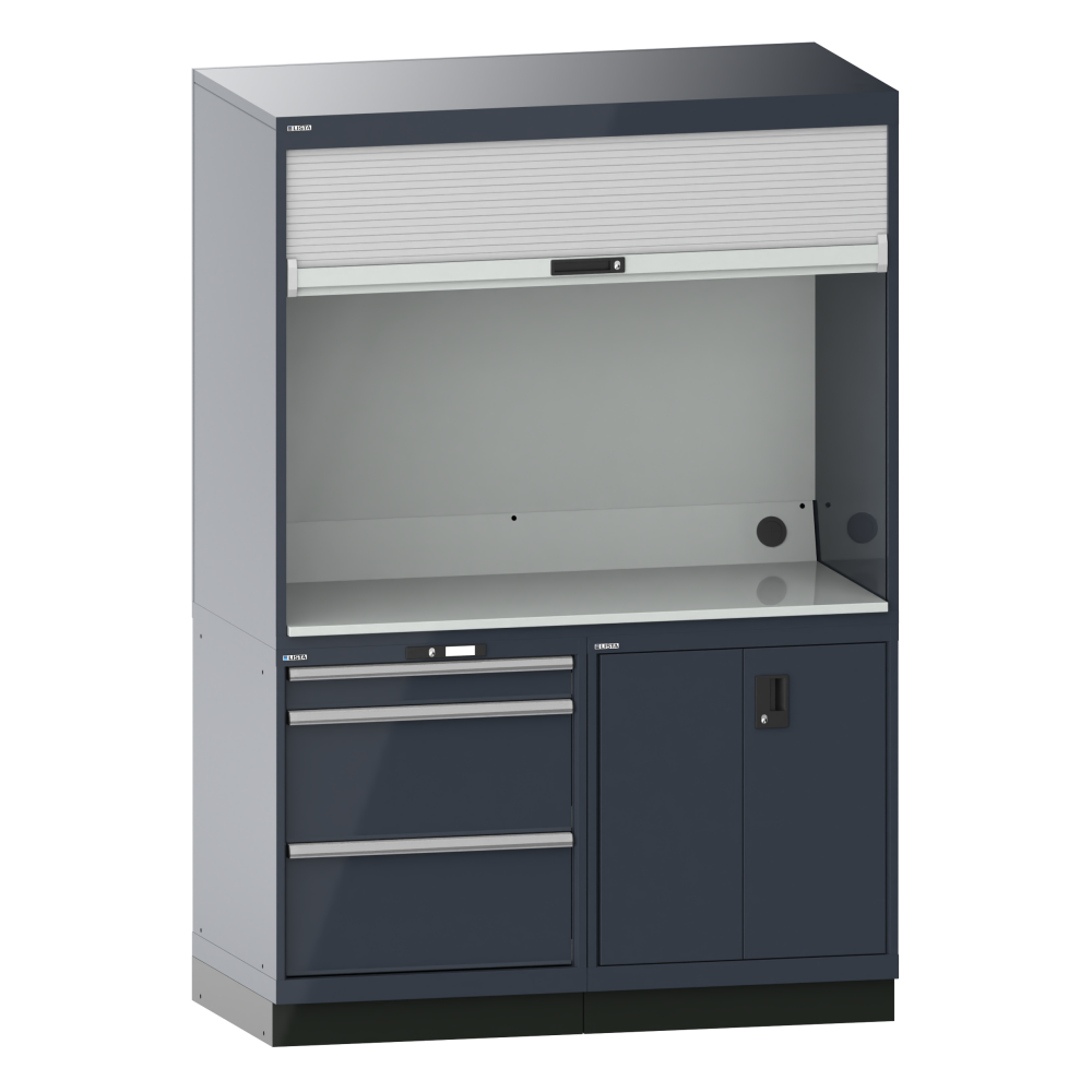 avec rideaux, tiroirs, portes d'écran et battantes pour la protection du matériel de valeur et des documents importants