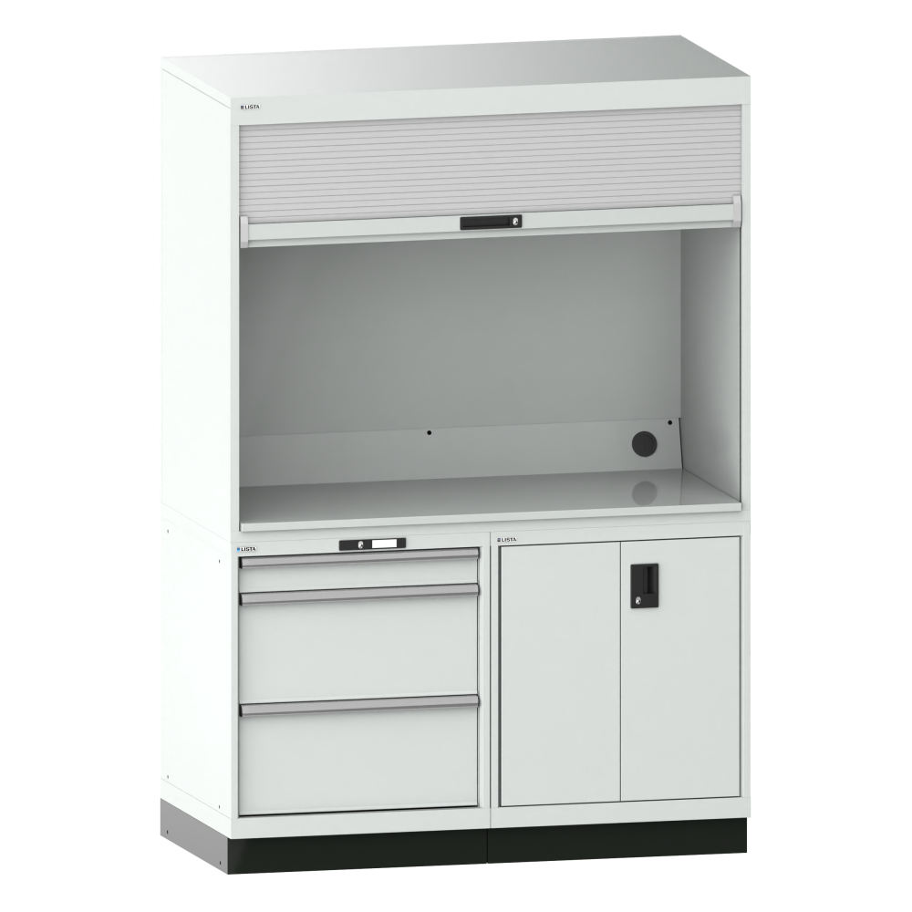 Armoire Qualité : Avec rideau en plastique et cylindre de fermeture, câble de raccordement de 3 m de long, plateau en laminé dur comme surface de travail, installé sans outils, électrification avec 4 ou 5 prises (230V) et commutateur à bascule pour la lampe montée dans le couvercle du bâti.