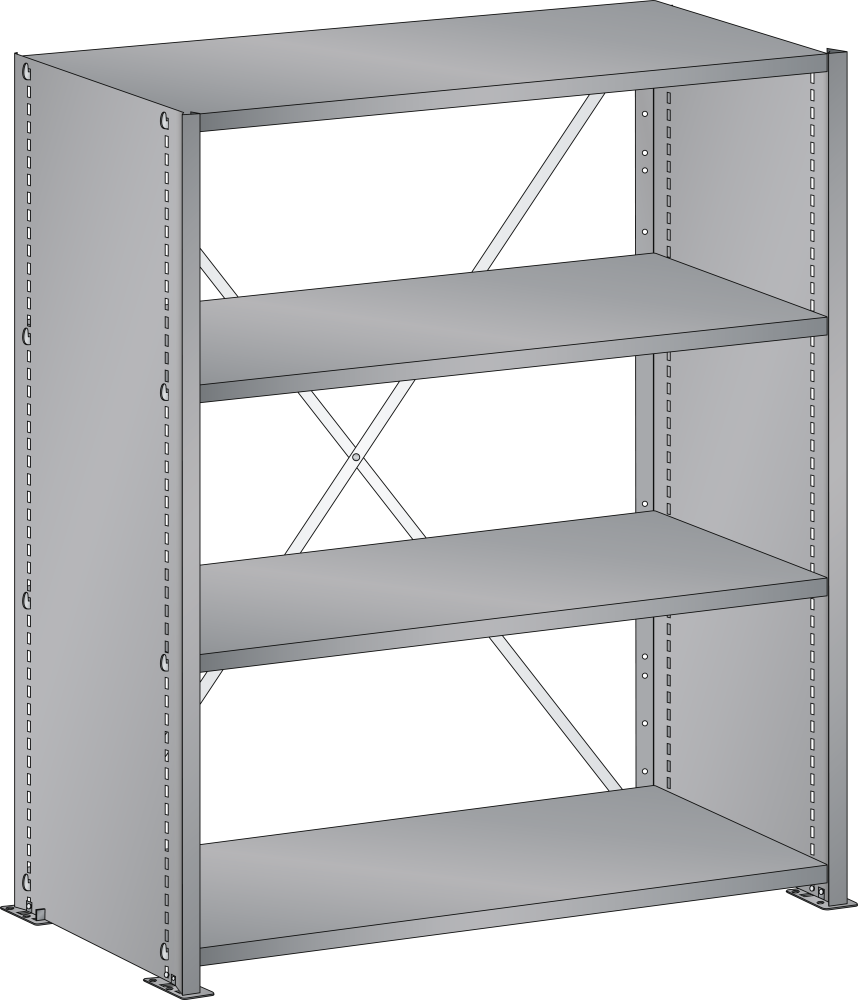 Paroi latérale en tôle pleine, charge admissible max. 1 000 kg : Standard avec pliure triangulaire à l'avant. Division des fentes de 25 mm, pour accrocher les supports de rayon. Jeu de plaques de pied fourni, galvanisé. Exécution : tôle d'acier. Couleur : selon planche des couleurs ou galvanisé.