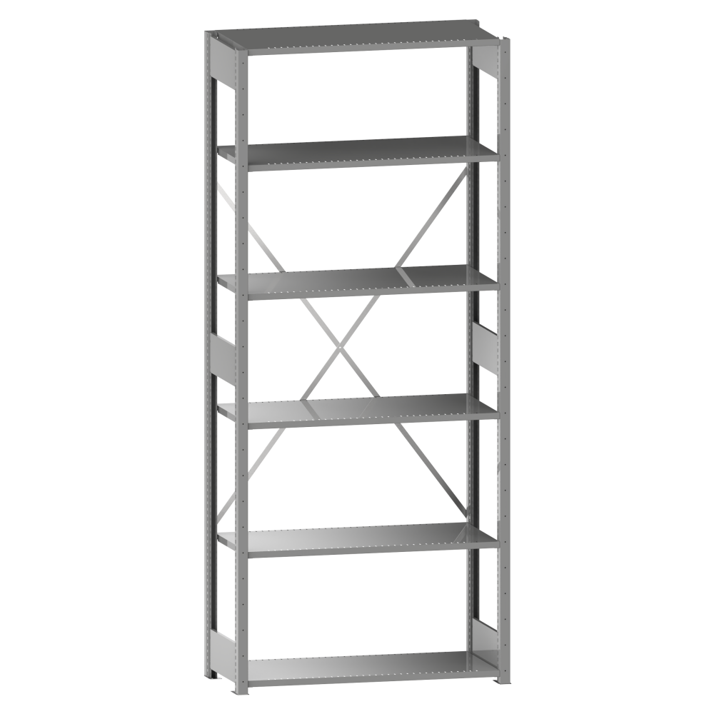 Paire de montants, capacité de charge max. 2 800 kg : Composée de 2 montants, 2 plaques de pied et 3 entretoises (4 entretoises pour une hauteur de 3000 mm). Division des fentes de 25 mm, pour accrocher les supports de rayon à la hauteur souhaitée, matériel de vissage fourni. Exécution : montants en profilés en C, laminés à froid, 40 × 75 mm, à bords pliés 6 fois pour une meilleure stabilité. Plaque de pied galvanisée. Couleur : selon planche des couleurs ou galvanisé.