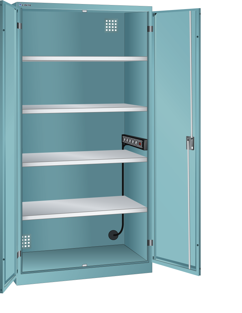 Armadi caricabatteria con porte battenti: tutti gli armadi possiedono, in base al modello, la dotazione seguente: ripiano spostabile zincato, spessore 30 mm, portata 60 kg, cassetto verniciato, grigio antracite (RAL 7016), portata 50 kg, listelli multipresa con interruttore On/Off e 4 o 5 prese da 230 V.