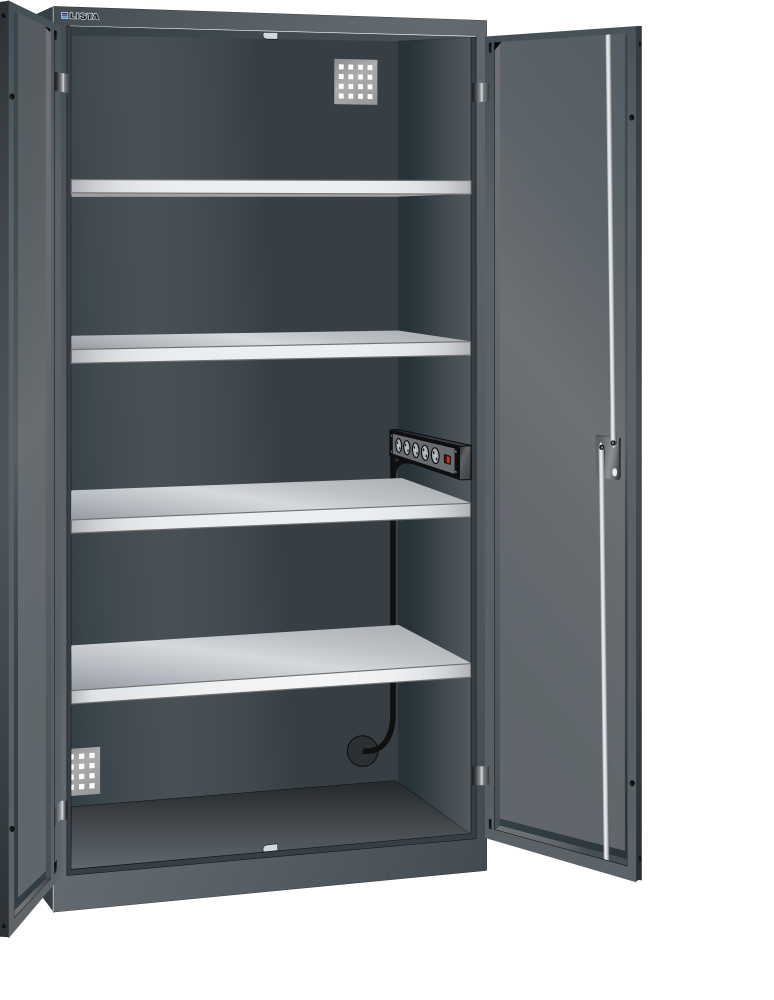 Armadi caricabatteria con porte battenti: tutti gli armadi possiedono, in base al modello, la dotazione seguente: ripiano spostabile zincato, spessore 30 mm, portata 60 kg, cassetto verniciato, grigio antracite (RAL 7016), portata 50 kg, listelli multipresa con interruttore On/Off e 4 o 5 prese da 230 V.