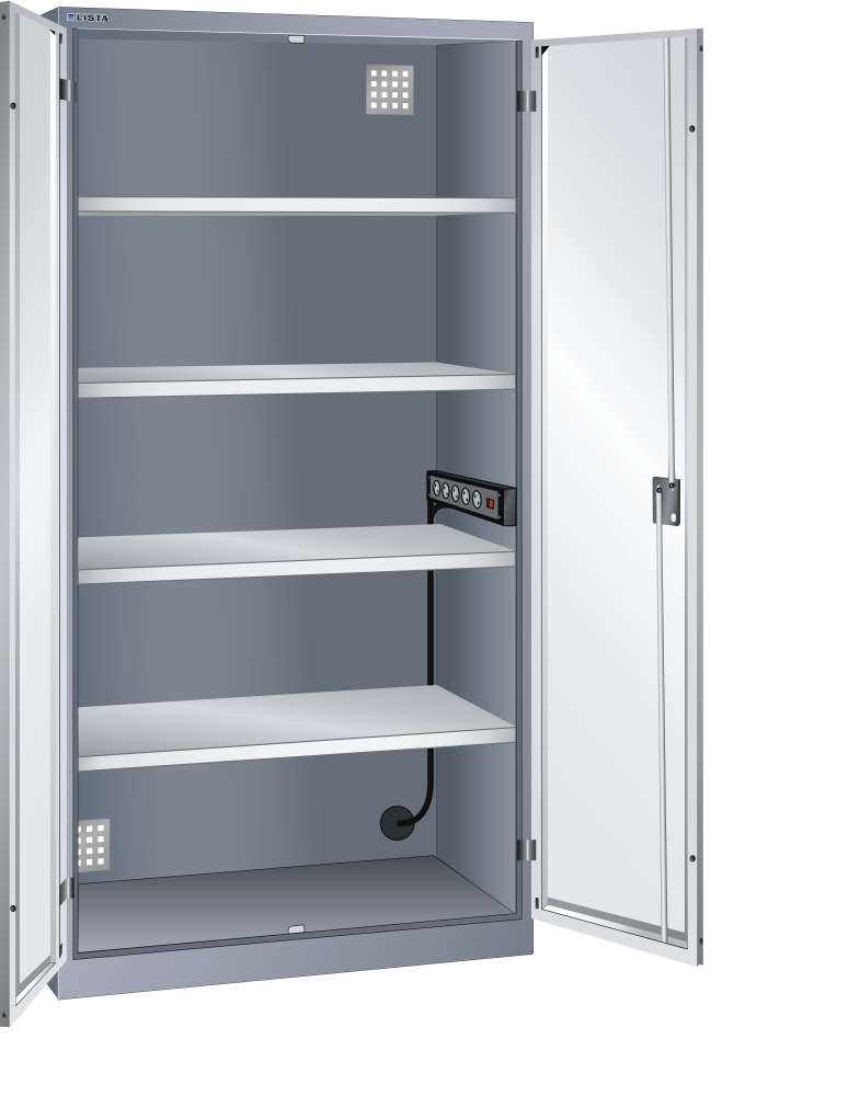 Armadi caricabatteria con porte battenti: tutti gli armadi possiedono, in base al modello, la dotazione seguente: ripiano spostabile zincato, spessore 30 mm, portata 60 kg, cassetto verniciato, grigio antracite (RAL 7016), portata 50 kg, listelli multipresa con interruttore On/Off e 4 o 5 prese da 230 V.