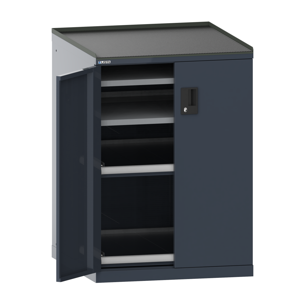 Ripiani estraibili e ripiani spostabili: in lamiera d'acciaio, grigio piccione, NCS S 4502-B. Ripiano estraibile con pianetti a lamelle zincati inseriti (profilo in lamiera d'acciaio), ripiano spostabile liscio. Grazie al passo di 25 mm nei montanti verticali del corpo dell'armadio, è possibile posizionare i ripiani nel corpo stesso, nella sequenza desiderata.