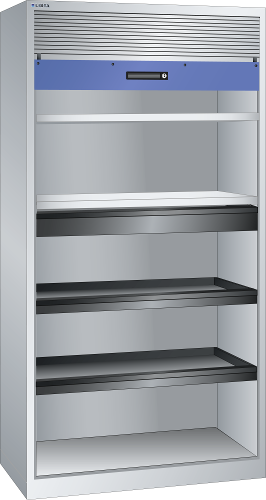 Armadi a tapparella: tutti gli armadi possiedono, in base al modello, la dotazione seguente: ripiano spostabile zincato, spessore 30 mm, portata 60 kg, ripiano estraibile e cassetto verniciati, grigio antracite, RAL 7016, portata 50 kg, tapparella in PVC, colore simile al grigio luce, RAL 7035.