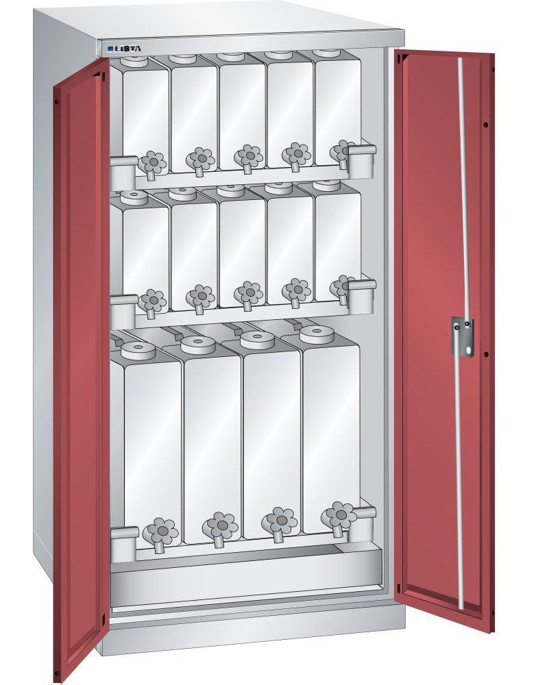 Armadi per liquidi: gli armadi sono dotati di: vasca recupero in acciaio cromato, spessore 2 mm, saldatura a tenuta di liquidi in conformità con la legge sulla tutela delle acque § 19 /StawaR, capacità 40 litri, ripiani per taniche verniciati in grigio, NCS 4502-B, taniche di polietilene ad alta densità con rubinetto di scarico cromato lucido. Porte battenti in lamiera piena smussate su una parte, con perno, apertura con angolo di 235°.