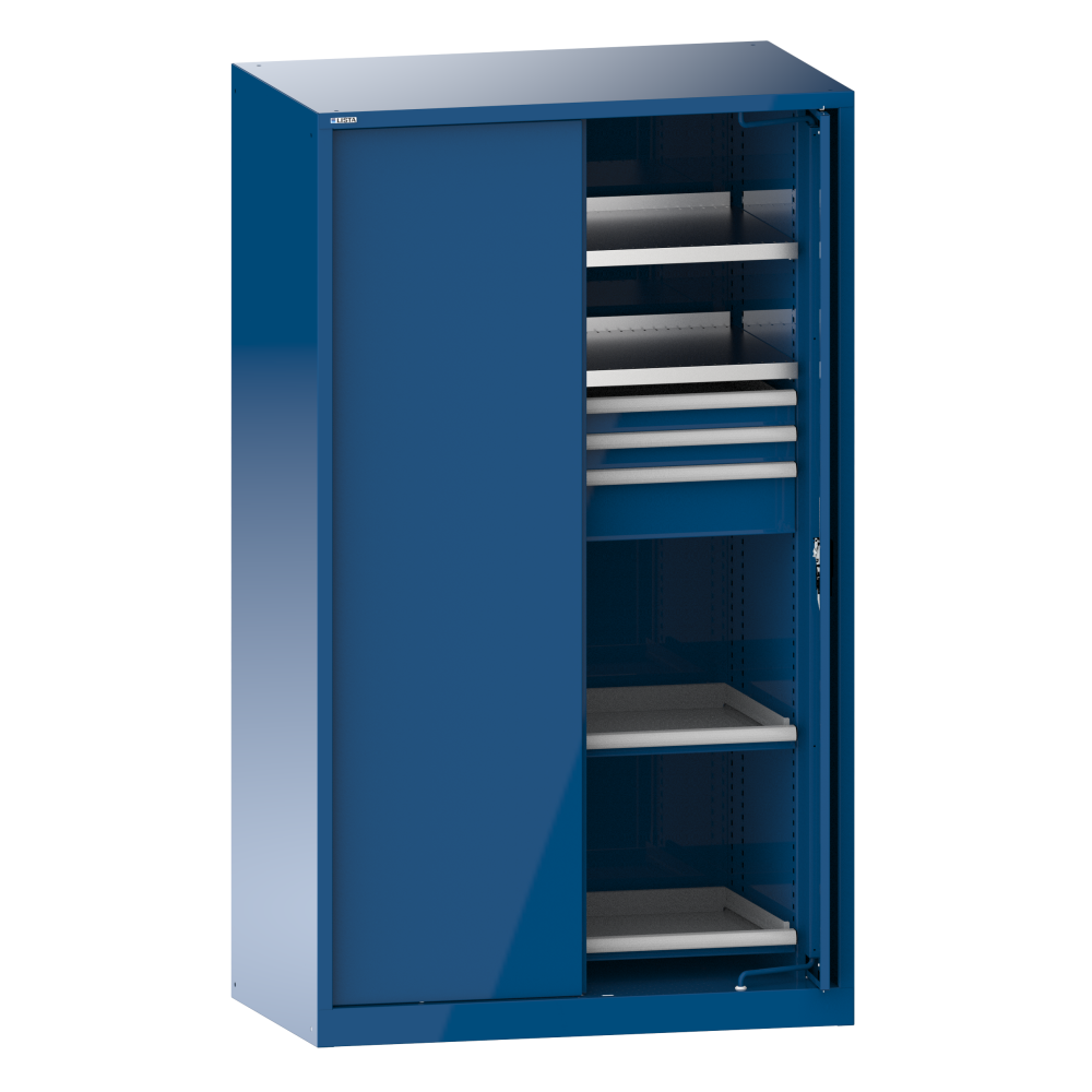 Armadi per merci pesanti con porte a scomparsa: gli armadi sono dotati di: ripiani spostabili zincati, 33 mm spessore, ripiani estraibili e cassetti verniciati solitamente in grigio, NCS 4502-B. Porte a scomparsa smussate da una parte, a scelta in lamiera piena oppure con riquadri trasparenti. Dotate di staffa per cerniera, angolo di rotazione di 90°; quando sono aperte, le porte sporgono di 85 mm. Il bloccaggio singolo dei cassetti garantisce la protezione antiribaltamento. Possibili chiusure KEY Lock, CODE Lock o RFID Lock.