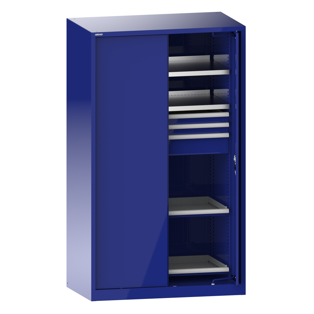 Armadi per merci pesanti con porte a scomparsa: gli armadi sono dotati di: ripiani spostabili zincati, 33 mm spessore, ripiani estraibili e cassetti verniciati solitamente in grigio, NCS 4502-B. Porte a scomparsa smussate da una parte, a scelta in lamiera piena oppure con riquadri trasparenti. Dotate di staffa per cerniera, angolo di rotazione di 90°; quando sono aperte, le porte sporgono di 85 mm. Il bloccaggio singolo dei cassetti garantisce la protezione antiribaltamento. Possibili chiusure KEY Lock, CODE Lock o RFID Lock.