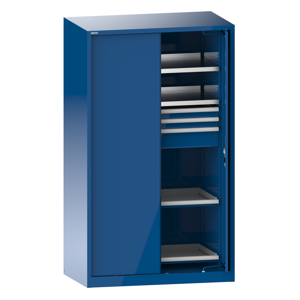 Armadi per merci pesanti con porte a scomparsa: gli armadi sono dotati di: ripiani spostabili zincati, 33 mm spessore, ripiani estraibili e cassetti verniciati solitamente in grigio, NCS 4502-B. Porte a scomparsa smussate da una parte, a scelta in lamiera piena oppure con riquadri trasparenti. Dotate di staffa per cerniera, angolo di rotazione di 90°; quando sono aperte, le porte sporgono di 85 mm. Il bloccaggio singolo dei cassetti garantisce la protezione antiribaltamento. Possibili chiusure KEY Lock, CODE Lock o RFID Lock.
