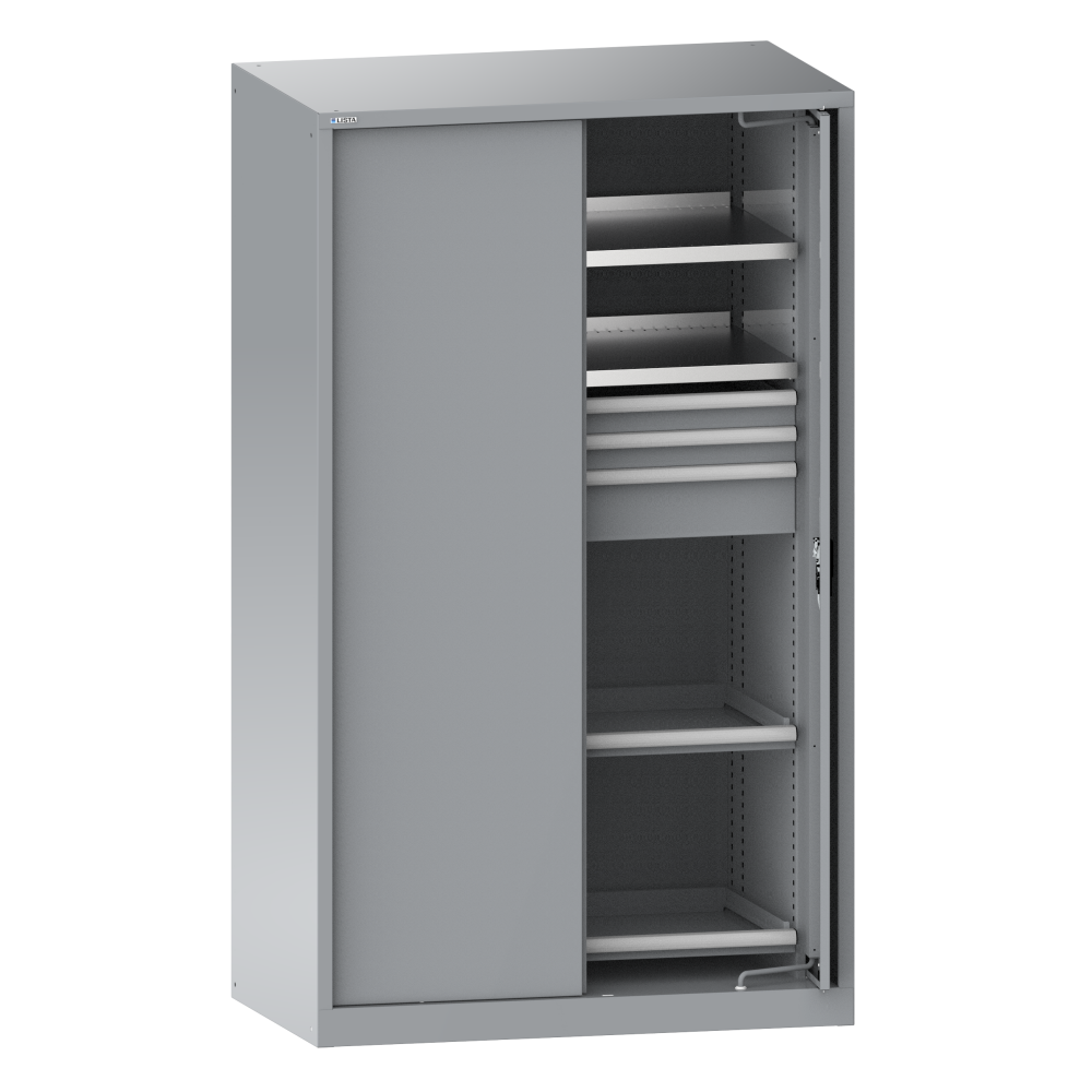 Armadi per merci pesanti con porte a scomparsa: gli armadi sono dotati di: ripiani spostabili zincati, 33 mm spessore, ripiani estraibili e cassetti verniciati solitamente in grigio, NCS 4502-B. Porte a scomparsa smussate da una parte, a scelta in lamiera piena oppure con riquadri trasparenti. Dotate di staffa per cerniera, angolo di rotazione di 90°; quando sono aperte, le porte sporgono di 85 mm. Il bloccaggio singolo dei cassetti garantisce la protezione antiribaltamento. Possibili chiusure KEY Lock, CODE Lock o RFID Lock.