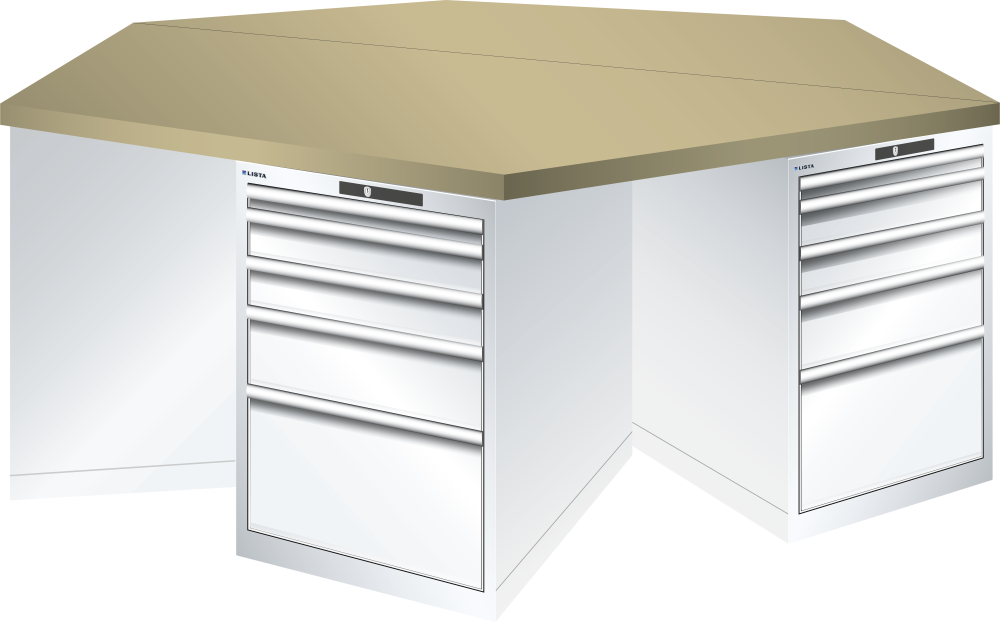 Bancho da lavoro esagonali 27x36E (LxPxA) 2500x2165x840mm 6 x 5 cassetti (1x50/2x100/1x150/1x300) 75kg Multiplex CODE Lock Bianco puro RAL 9010