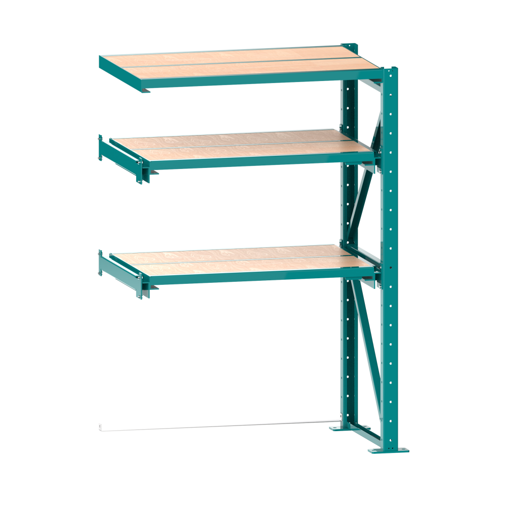 Scaffali con ripiani estraibili per merci pesanti, smontati: Con 2 telai estraibili ad estrazione semplice (estrazione semplice, 65% estrazione) e 1 telaio fisso come ripiano superiore, ciascuno comprensivo di inserti in truciolato pressato, spessore 40 mm. Attrezzabili a piacere con pareti laterali, ulteriori telai estraibili e fissi, coperture, ante scorrevoli, tapparelle e paraurti per montante. Campata base inclusi 1 coppia diagonali per la stabilizzazione longitudinale, 2 telai di sostegno, ancoraggio al suolo e set di piastre di livellamento. Campata aggiuntiva inclusi 1 telaio di sostegno, ancoraggio al suolo e set di piastre di livellamento. Passo fori nei montanti ogni 100 mm. Versione: lamiera d’acciaio. Colore: come da tabella colori. Nota: a partire dalla terza campata aggiuntiva è necessaria un’ulteriore coppia diagonali (cfr. pag. 242).